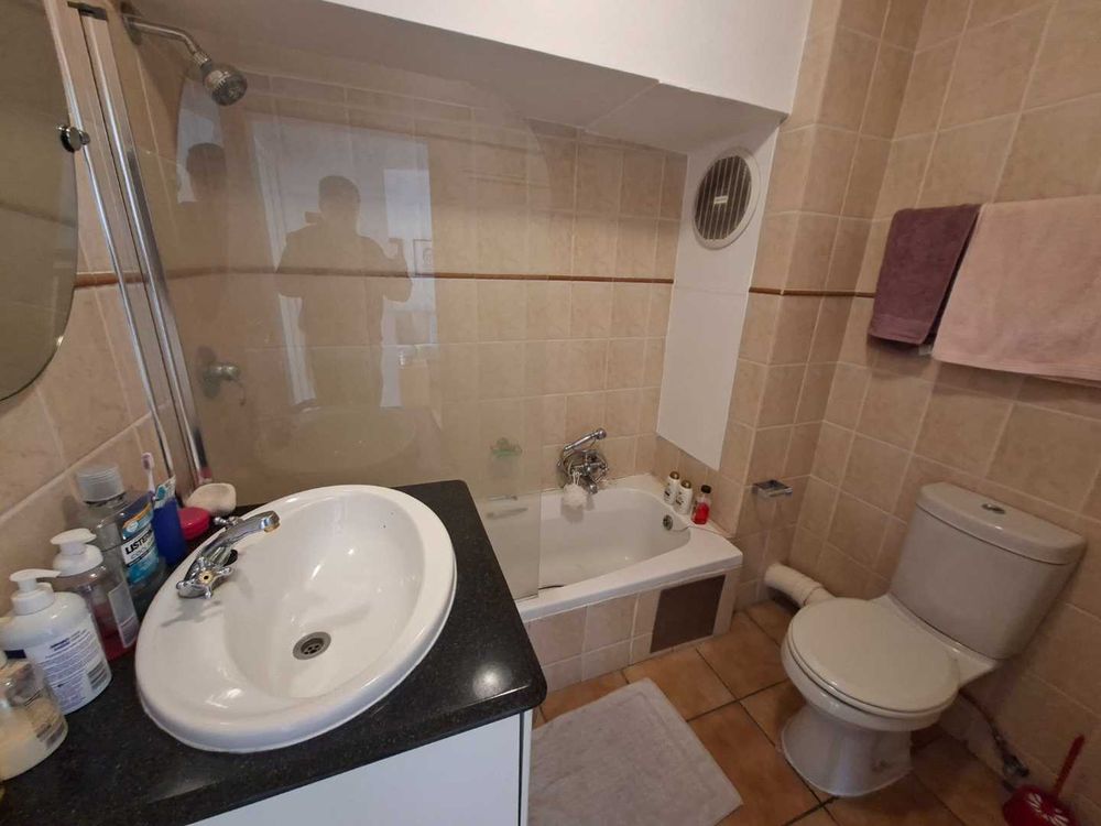 The full bathroom is neatly finished and includes a bath, shower, toilet, and basin.