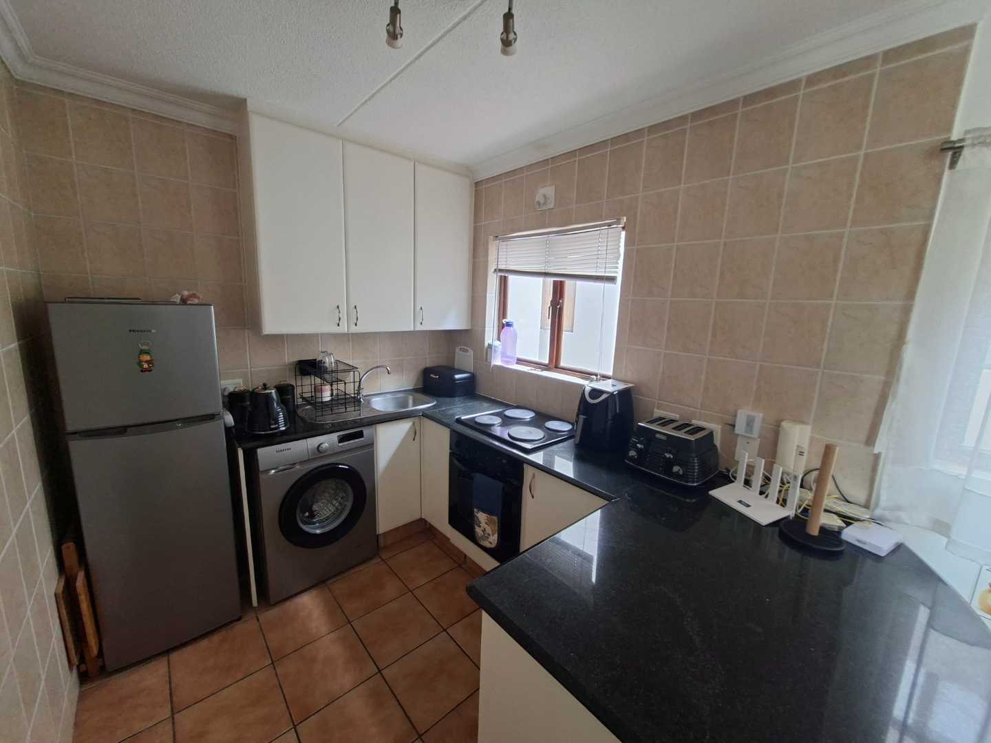 The modern open-plan kitchen boasts granite countertops, built-in cupboards, a stove and hob, and overlooks the tiled lounge area, making it ideal for easy living and entertaining.