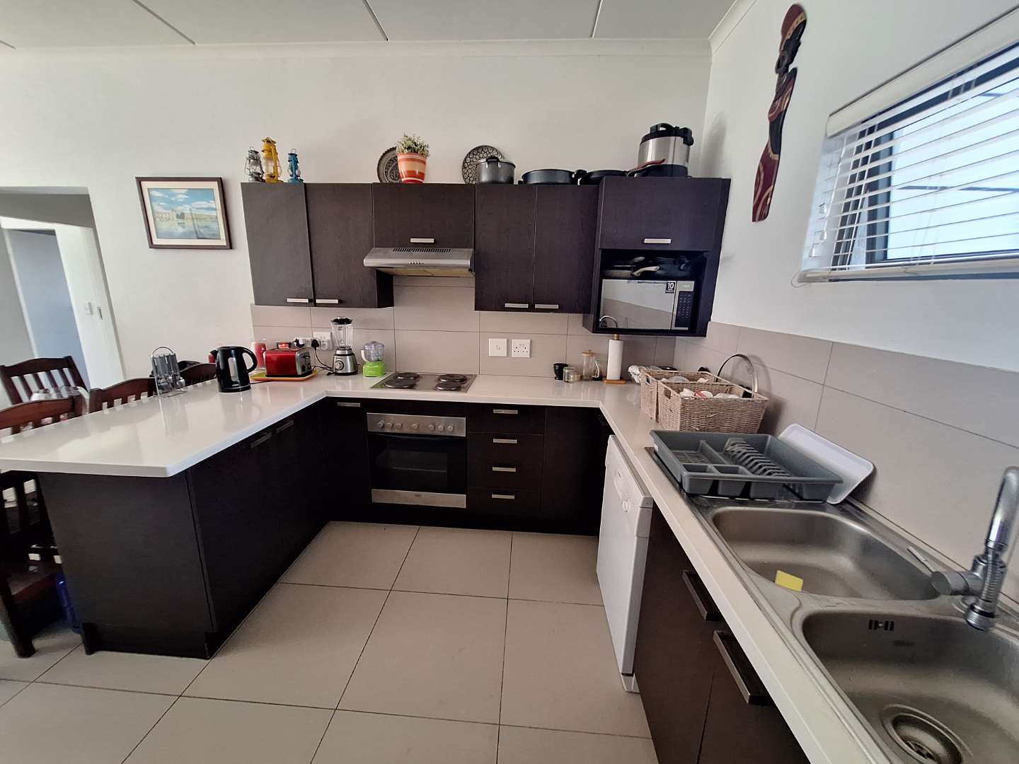 Bright, open-plan tiled living area with space for a comfortable lounge and a small dining setup