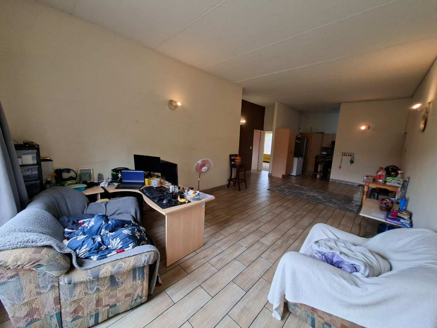 Large open-plan reception area with ample space for both a lounge suite and a dining room suite